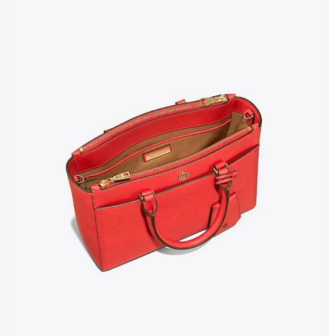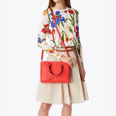 这款 Tory burch Robinson 小号的双拉链手提包采用硬挺的十字纹牛皮,耐磨防剐蹭,两侧用搭扣来收缩的设计,前后双拉链,能够把所需要的东西分层装置,非常合理实用。带有可拆卸肩带,能斜跨也能手提,小号尺寸,即使娇小的女生也毫无违和感呢~适合通勤,也能出街!