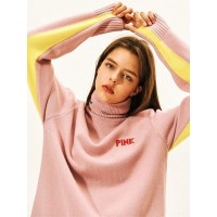 [IU,SNH48鞠婧祎,SONAMOO曹恩爱明星原款]宽松翻边高领字母点缀拼色男女同款毛衣_粉色