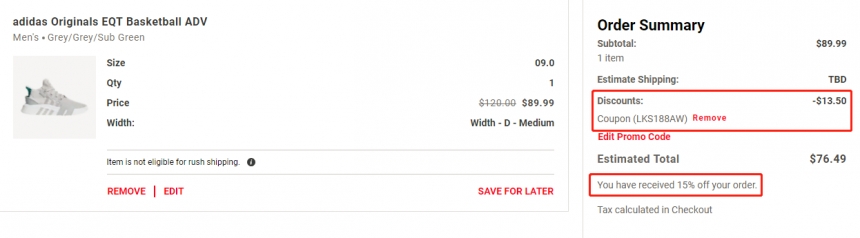 Foot Locker 现有 adidas Originals 三叶草 EQT Basketball ADV 男士篮球鞋 热卖,原价$120,现特价$76.49(约521元),需使用折扣码:LKS188AW,美国境内订单满$75免运费,需使用折扣码:LKS188AX。立即购买>>